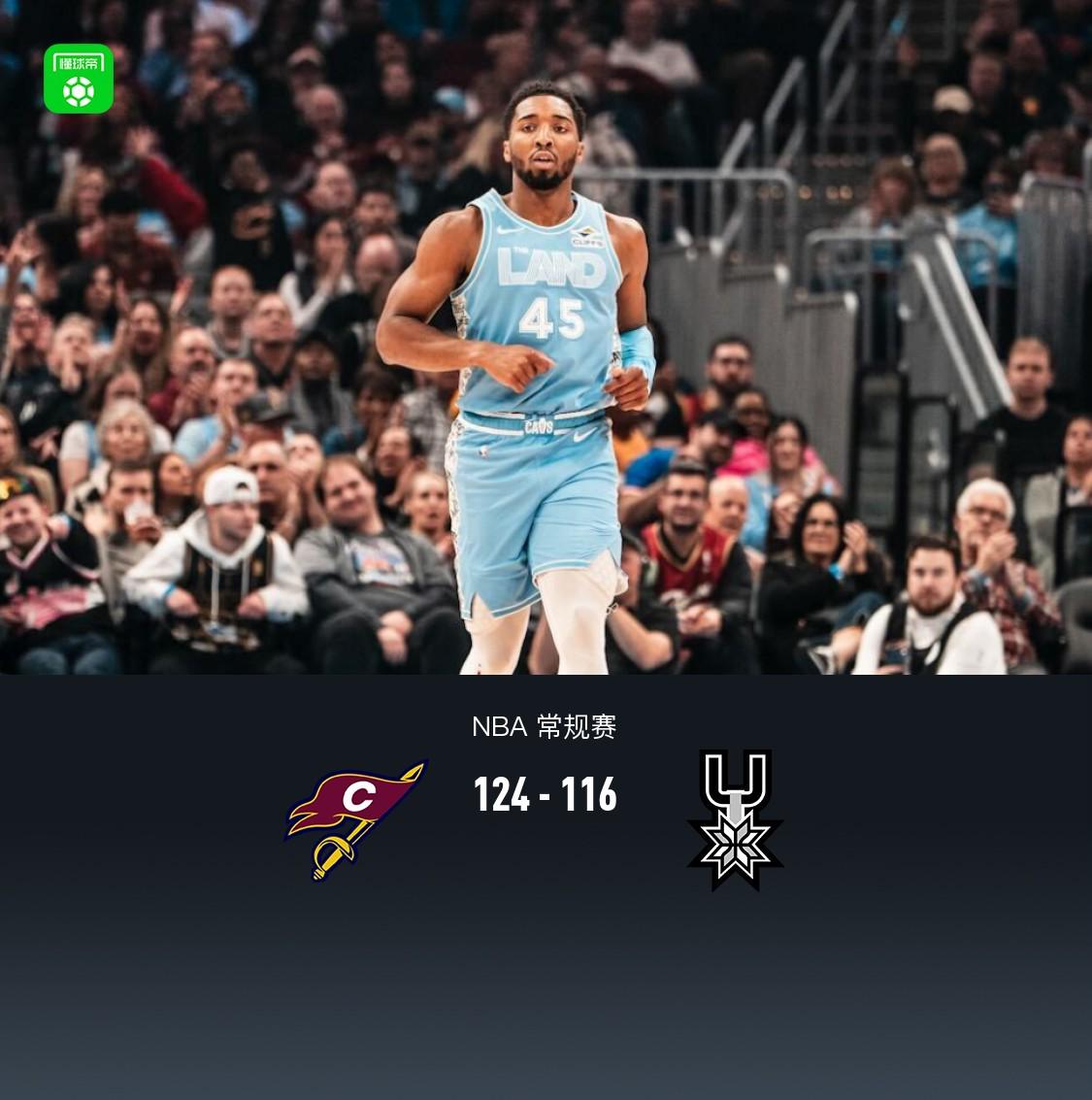 第四节骑士艾伦拿下19分,马刺斯蒂芬-卡斯尔拿下10分,最终骑士124-116战胜马刺