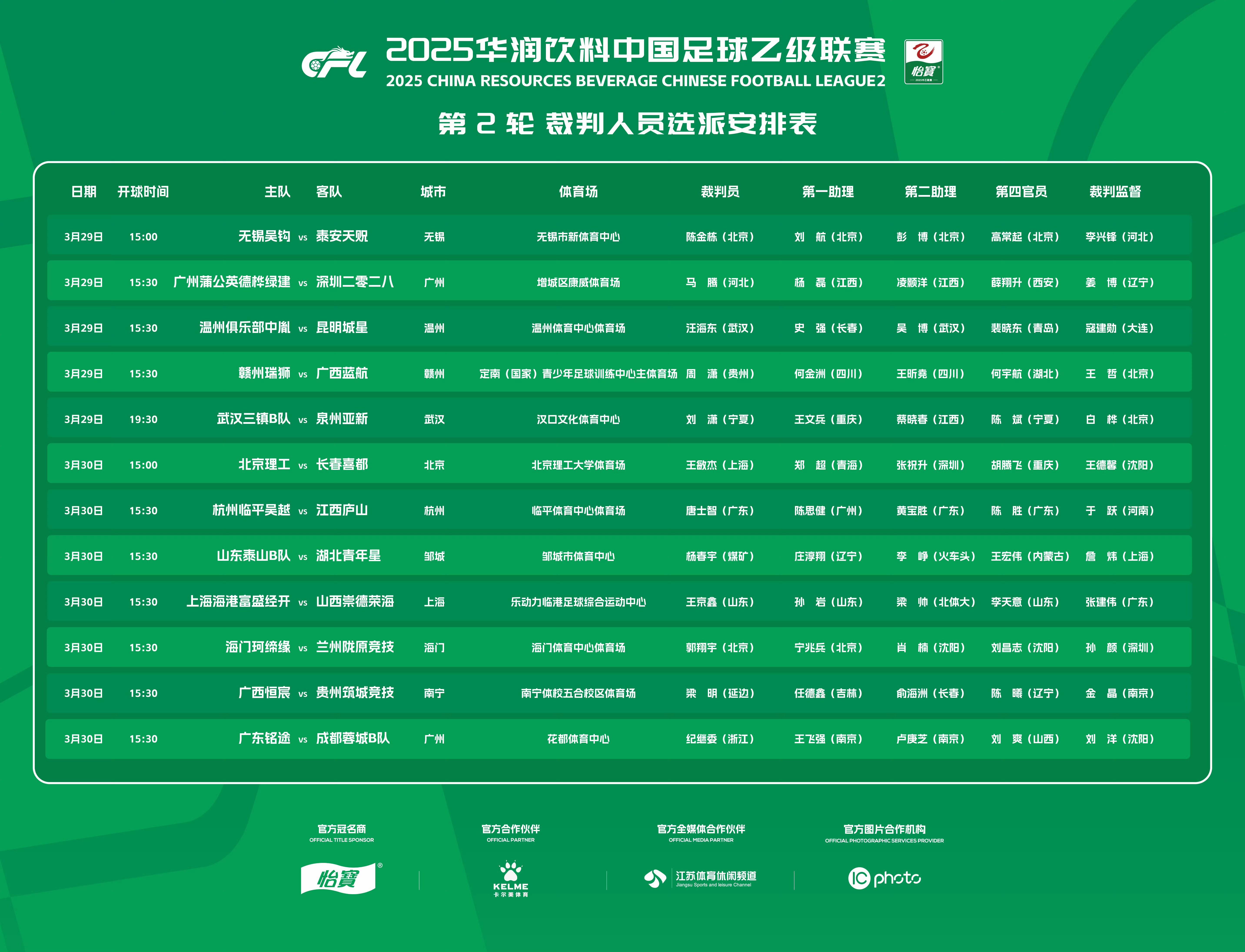 北京时间3月29日,中乙第2轮的裁判名单出炉,马腾执法广东德比广州 蒲公英 vs深圳二零二八。